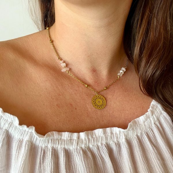 Envie de bonnes ondes et de douceur ? Ce collier est ton allié ! Le Quartz rose est là pour te rappeler chaque jour que l’amour commence par soi-même, tandis que la Fleur de Vie rééquilibre ton énergie et t’apporte harmonie et sérénité. Portes-le, et laisse les bonnes vibrations te suivre partout, comme un câlin énergétique autour du cou.